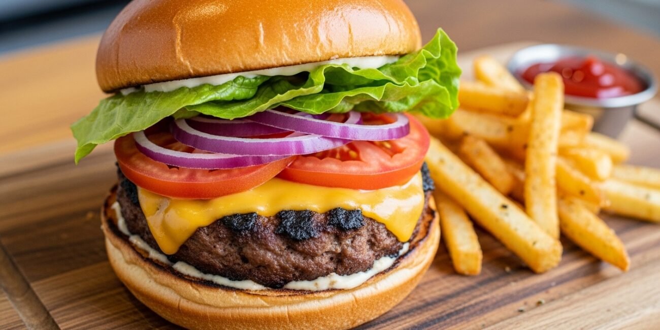 - Classic All-American: Serve your burger on a toasted brioche bun with crispy lettuce, a ripe tomato slice, red onion rings, sharp cheddar cheese, and a dollop of your favorite ketchup and mustard. A side of perfectly seasoned French fries or sweet potato fries is a must.